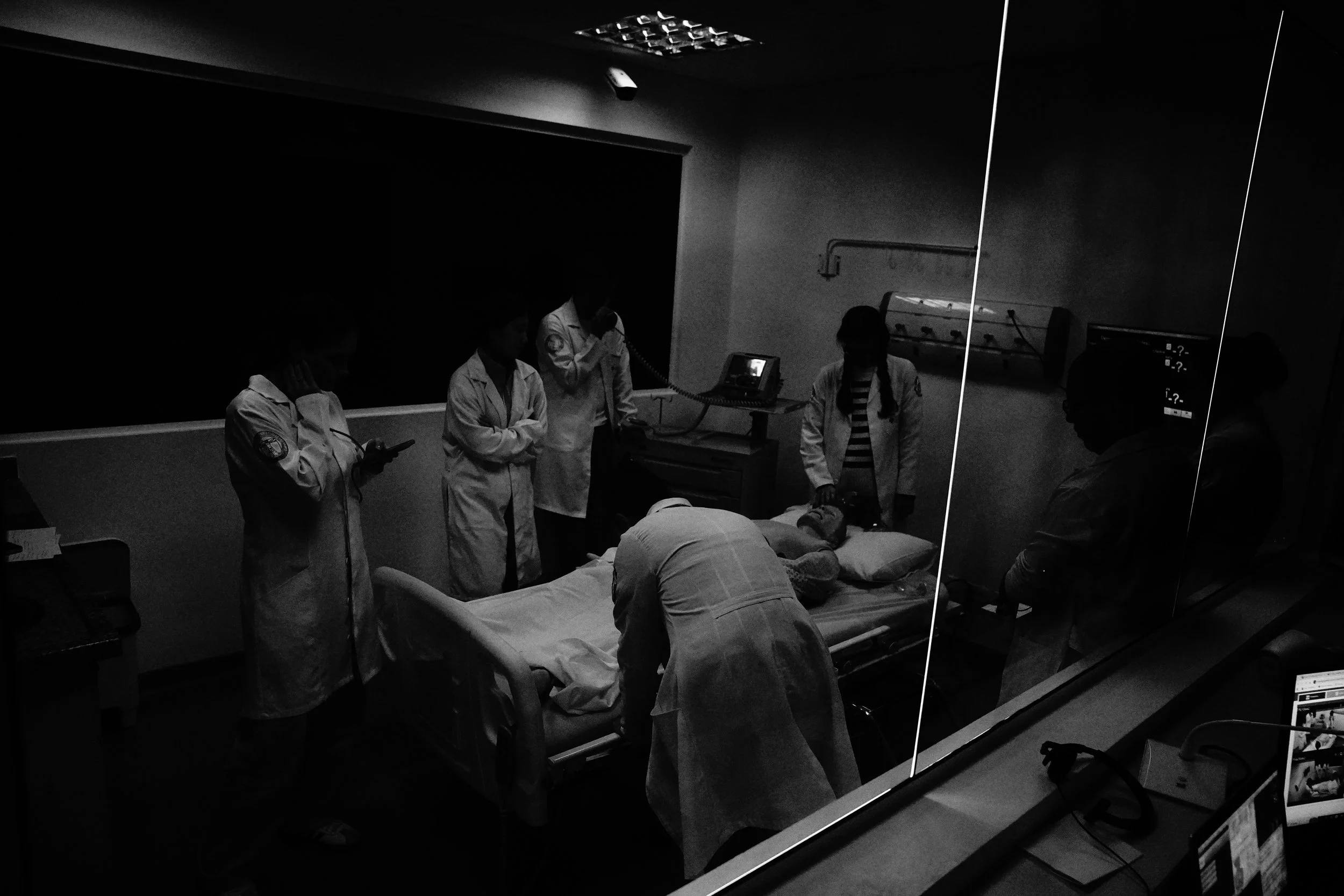 Inside the simulation room, young doctors rehearse the choreography of emergency — guided by quiet concentration, surrounded by the hum of monitors and reflection glass. Beneath the sterile light, they face the gravity of saving a life, even when the patient is only a mannequin. Sony A6400, 1/200s f2.8 ISO 6400, and incredible Viltrox 15mm up to f1.7.