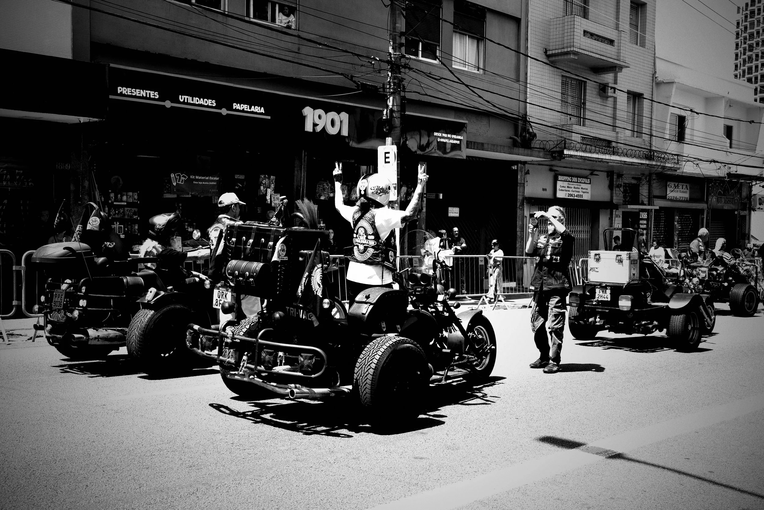 Arms raised, engines roaring in unison, and the street taken by the roar of freedom. The motorcycle parade celebrates urban spirit with power and pride. Ricoh GRIIIx, 1/100s f7.1 ISO 320.