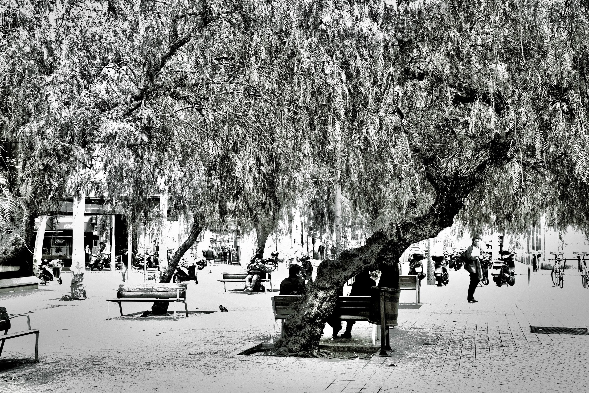 Under the soft canopy of trees along Passeig de Sant Joan, near Diagonal, the city slows down. Conversations fade into the hum of scooters and bicycles, and time seems to rest on the benches — between sunlight, shadow, and everyday life. Ricoh GRIIIx, 1/40s f6.3 ISO 800.